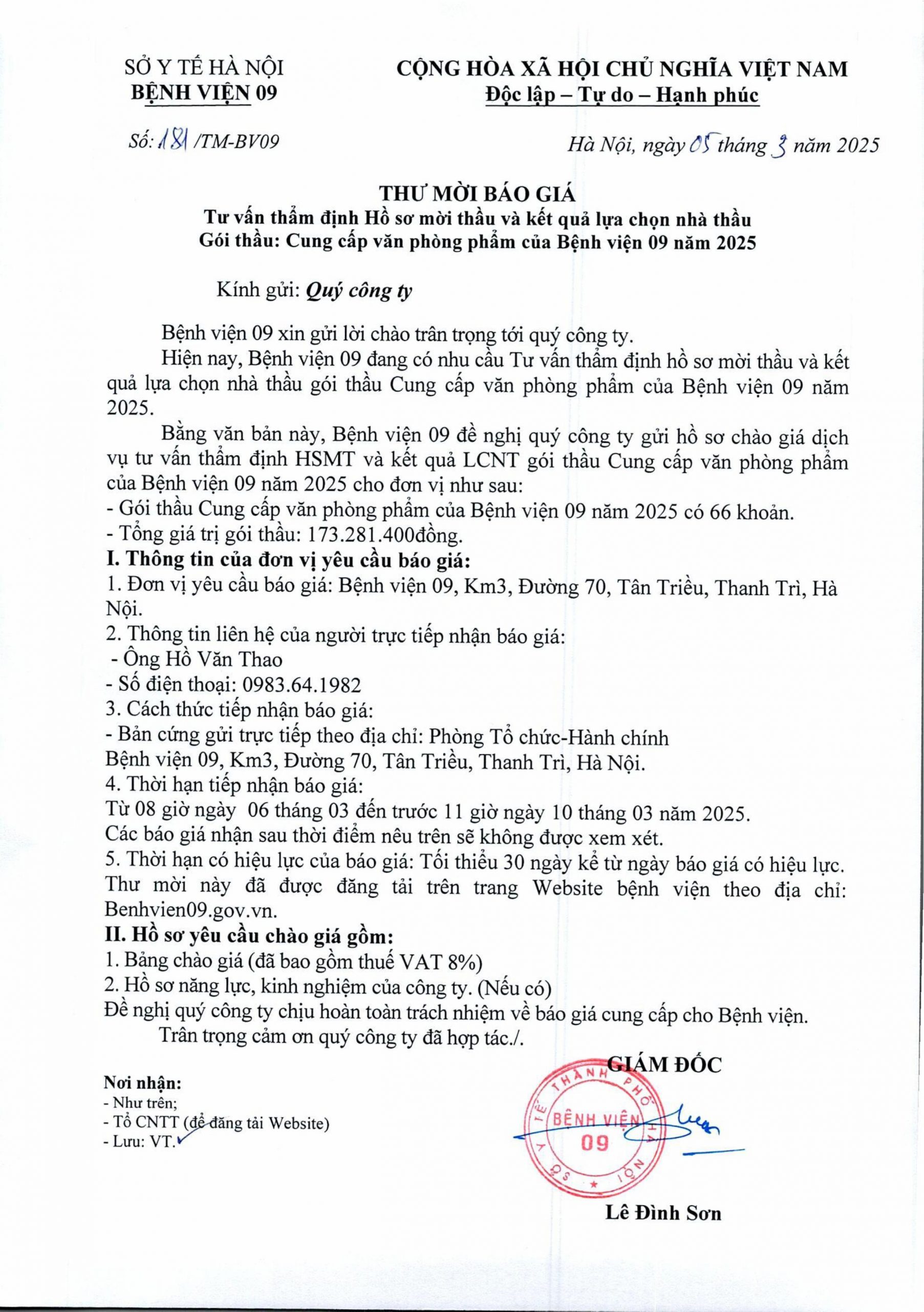 - Thư mời báo giá: “Thẩm định các gói thầu thuộc kế hoạch lựa chọn nhà thầu Cung cấp sản phẩm bồi dưỡng chế độ bằng hiện vật cho nhân viên y tế cho nhân viên y tế tại Bệnh viện 09 năm 2025”