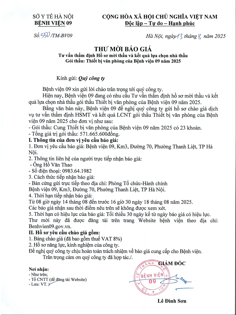 - Thư mời báo giá: ” Tư vấn thẩm định Hồ sơ mồi thầu và kết quả lựa chọn nhà thầu Gói thầu: Cung cấp văn phòng phẩm của Bệnh viện 09 năm 2025″