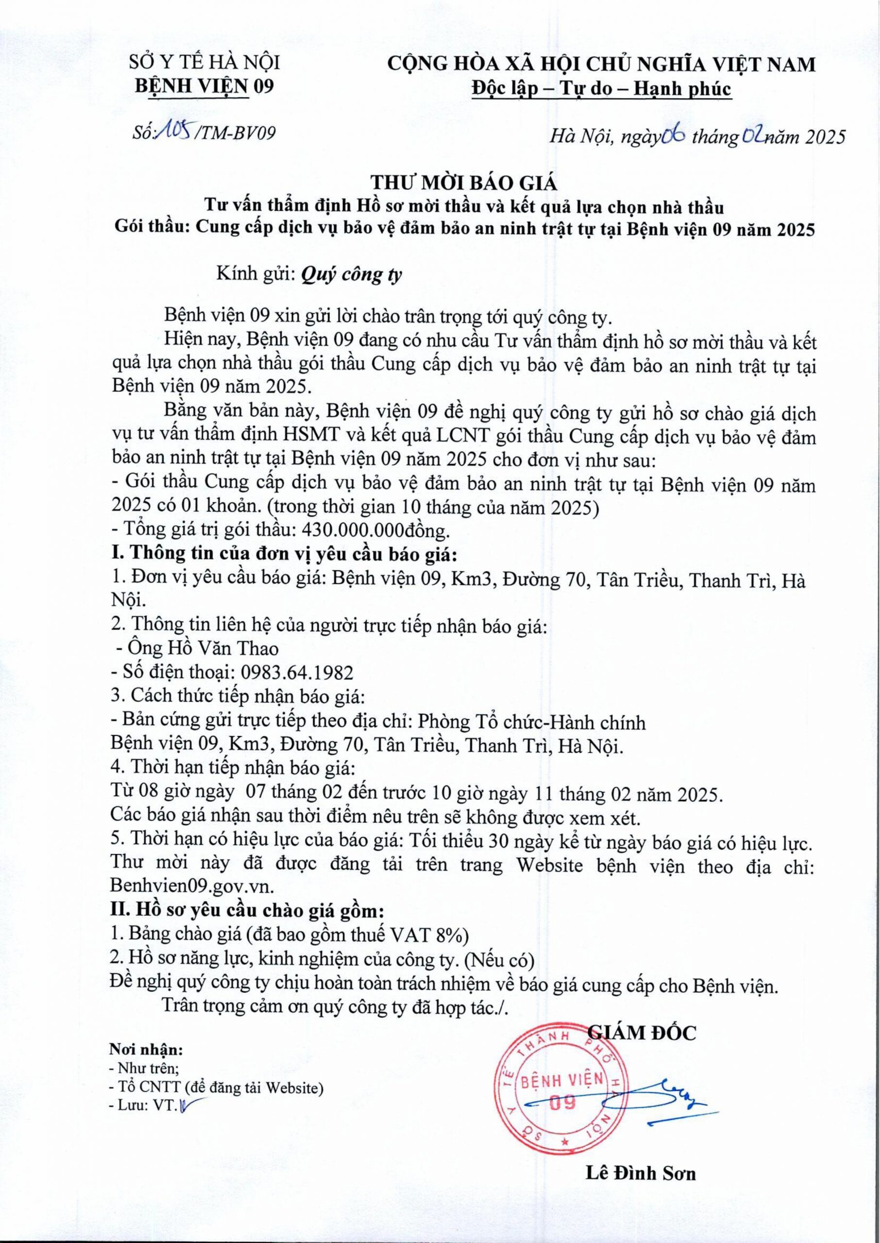 Tư vấn lập hồ sơ mời thầu và kết quả  lựa chọn nhà thầu Gói thầu: “Cung cấp dịch vệ bảo vệ đảm bảo an ninh trật tự tại Bệnh viện 09 năm 2025.”