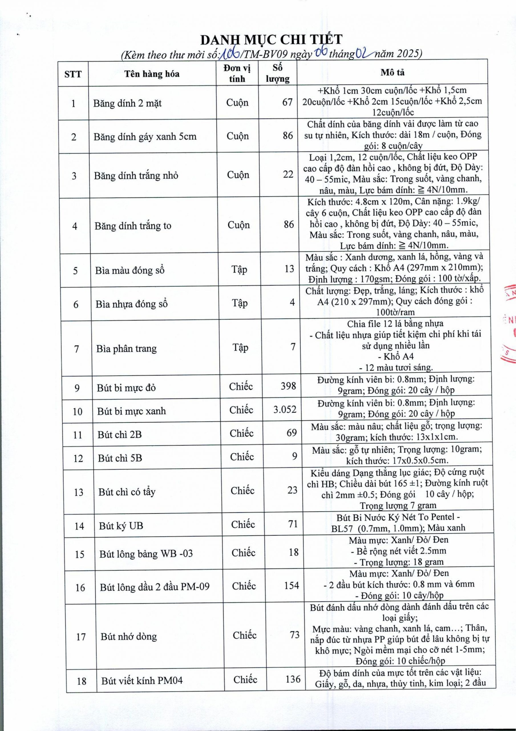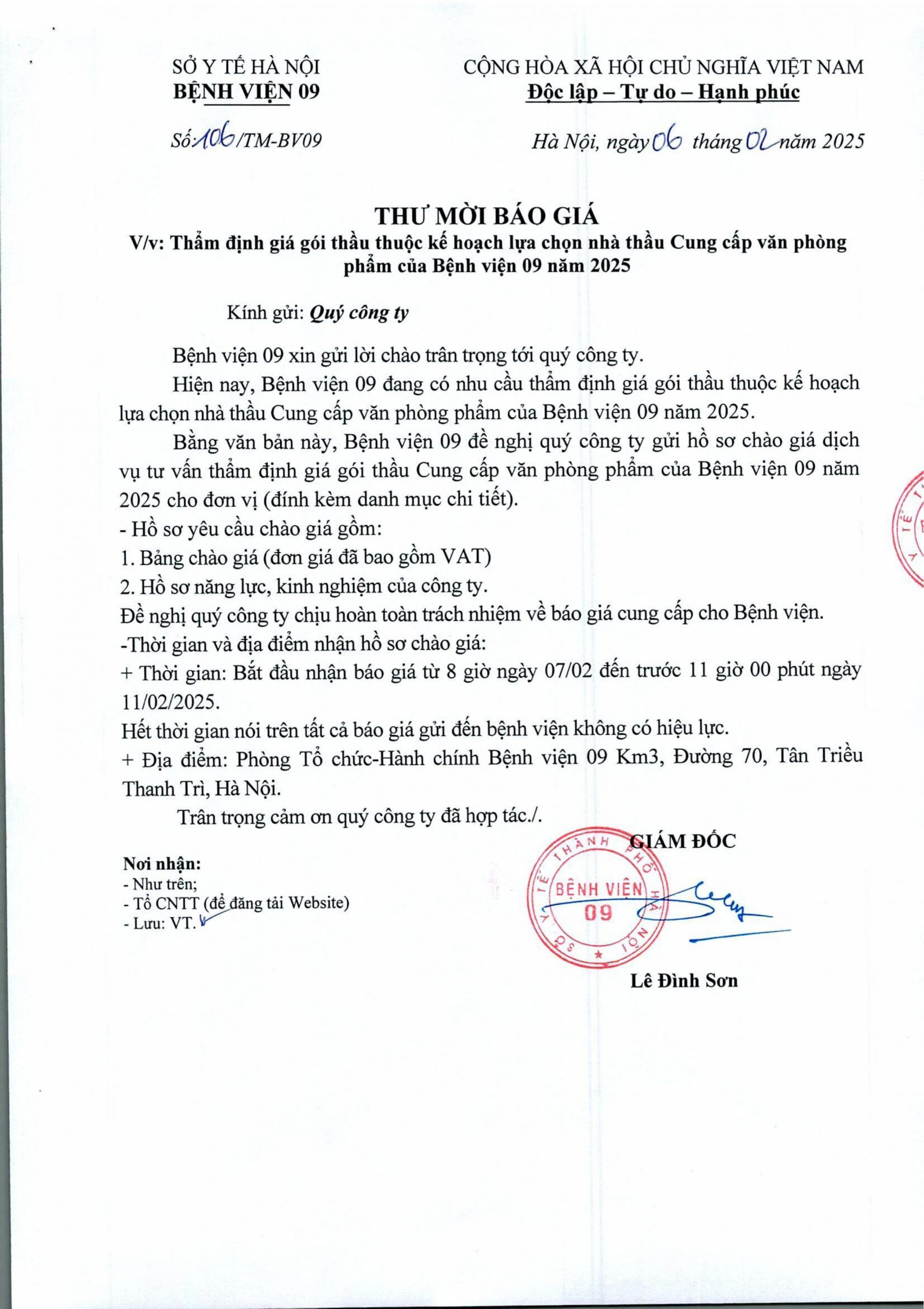 Tin tức Thư mời báo giá Posted on 06/02/2025 by Admin Bệnh viện 09 V/v: “Thẩm định gói thầu thuộc kế hoạch lựa chọn nhà thầu Cung cấp văn phòng phẩm của Bệnh viện 09 năm 2025” Công khai thực hiện dự toán thu-chi ngân sách quý III năm 2025 Yêu cầu báo giá: “Gói thầu khám sức khoẻ cán bộ nhân viên Bệnh viện 09 năm 2025” Thư mời báo giá: “Gói thầu Khám sức khoẻ cán bộ nhân viên Bệnh viện 09 năm 2025” Thư mời báo giá: “Tư vấn thẩm định Hồ sơ mời thầu và kết quả lựa chọn nhà thầu gói thầu May đồng phục y tế cho cán bộ Bệnh viện 09 năm 2025” Thư mời báo giá: “Tư vấn lập Hồ sơ mời thầu và đánh giá Hồ sơ dự thầu gói thầu May đồng phục y tế cho cán bộ Bệnh viện 09 năm 2025” Thư mời báo giá Thư mời báo giá
