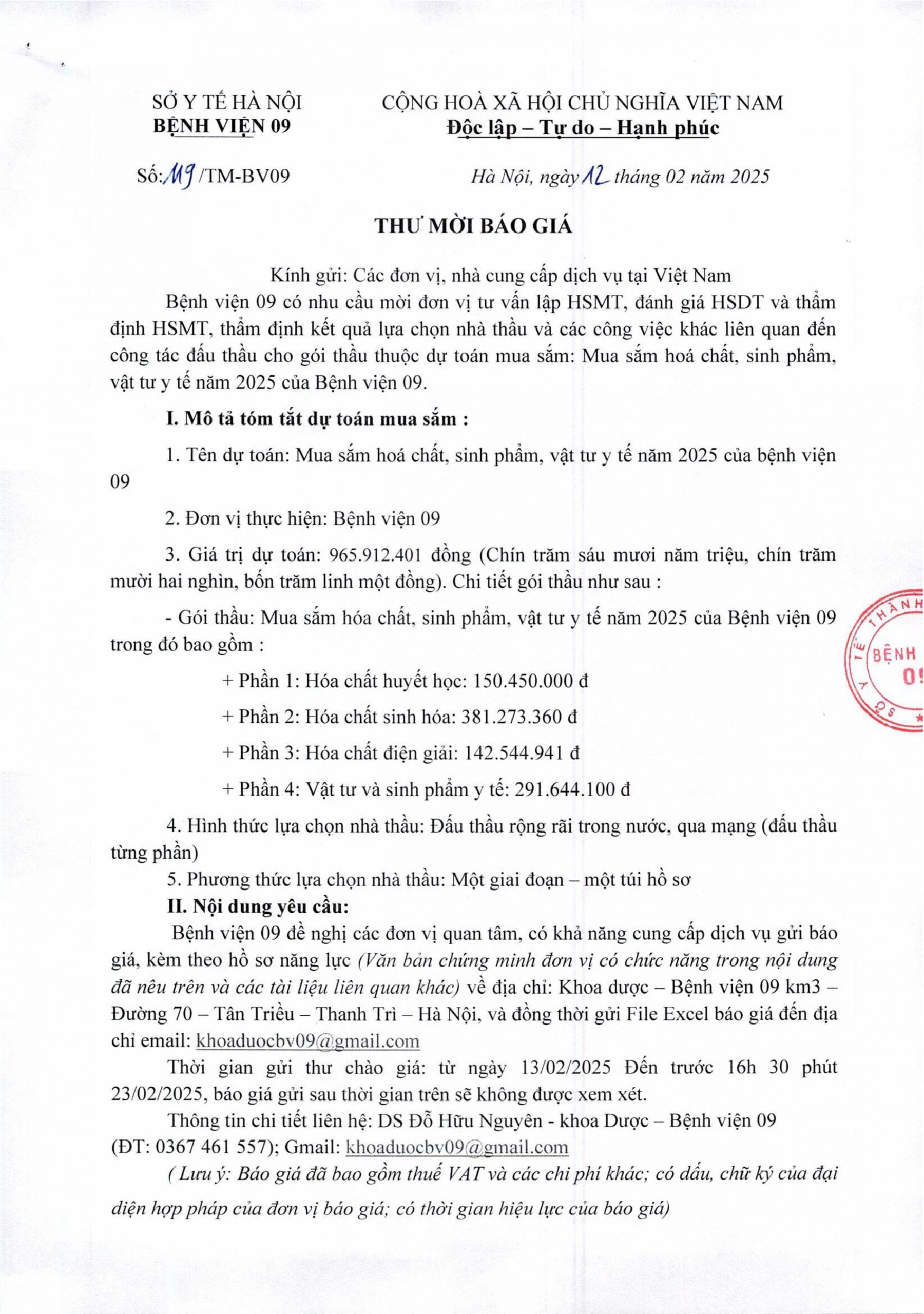 - Thư mời báo giá: “Tư vấn thẩm định Hồ sơ mời thầu và kết quả lựa chọn nhà thầu gói thầu May đồng phục y tế cho cán bộ Bệnh viện 09 năm 2025”