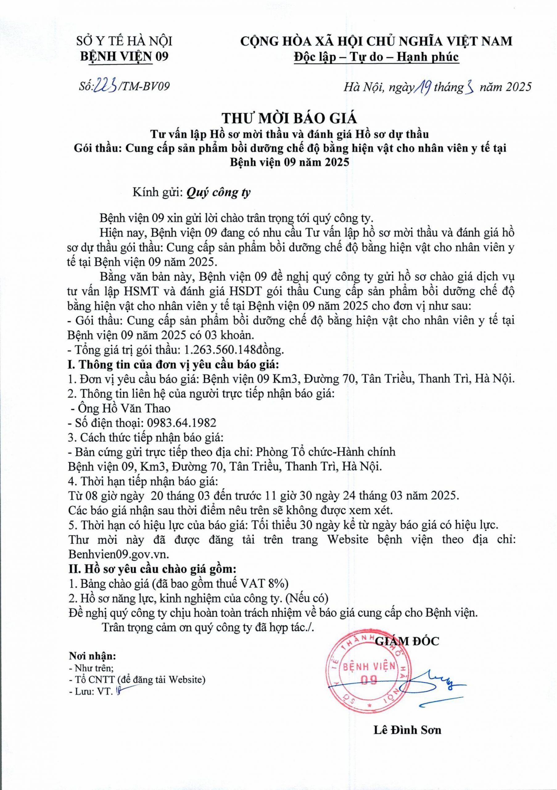Thư mời báo giá: “Tư vấn Hồ sơ mời thầu và đánh giá Hồ sơ dự thầu”. Gói thầu: cung cấp sản phẩm bồi dưỡng chế độ bằng hiện vật cho nhân viên y tế tại Bệnh viện 09 năm 2025