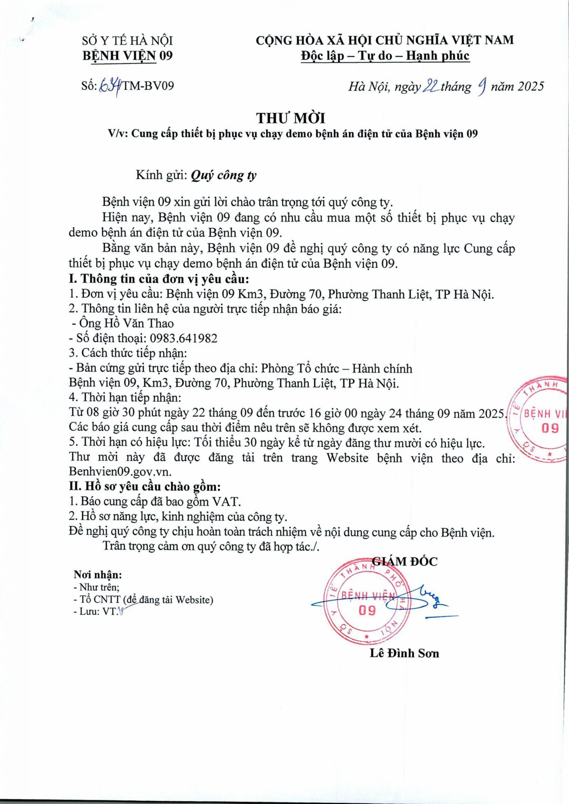 Thư mời: “Cung cấp thiết bị phục vụ chạy demo bệnh án điện tử của Bệnh viện 09”