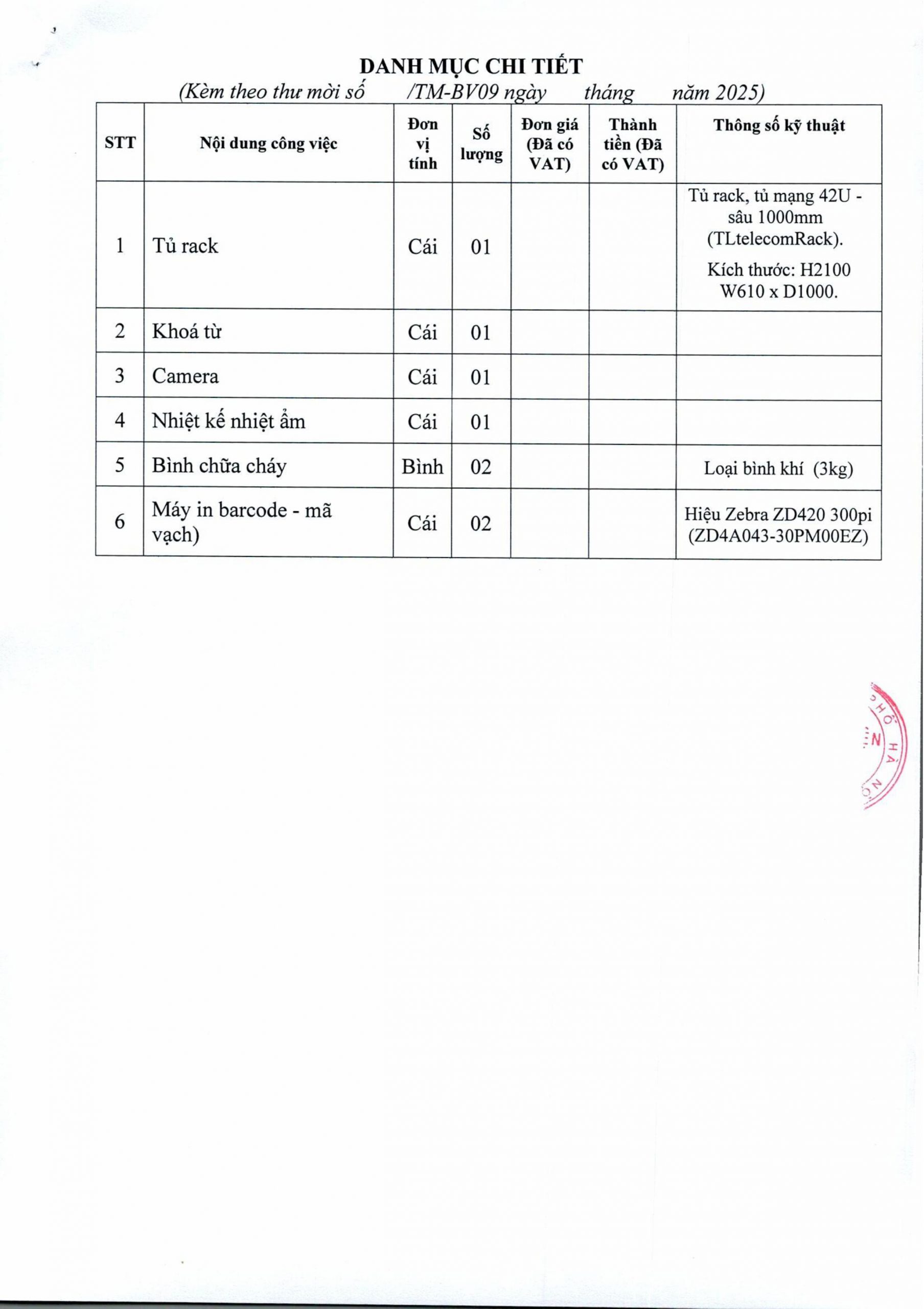 Thư mời báo giá: “Thẩm định giá gói thầu thuộc kế hoạch lưa chọn nhà thầu gói Mua sắm trang thiết bị y tế năm 2025 của Bệnh viện 09”