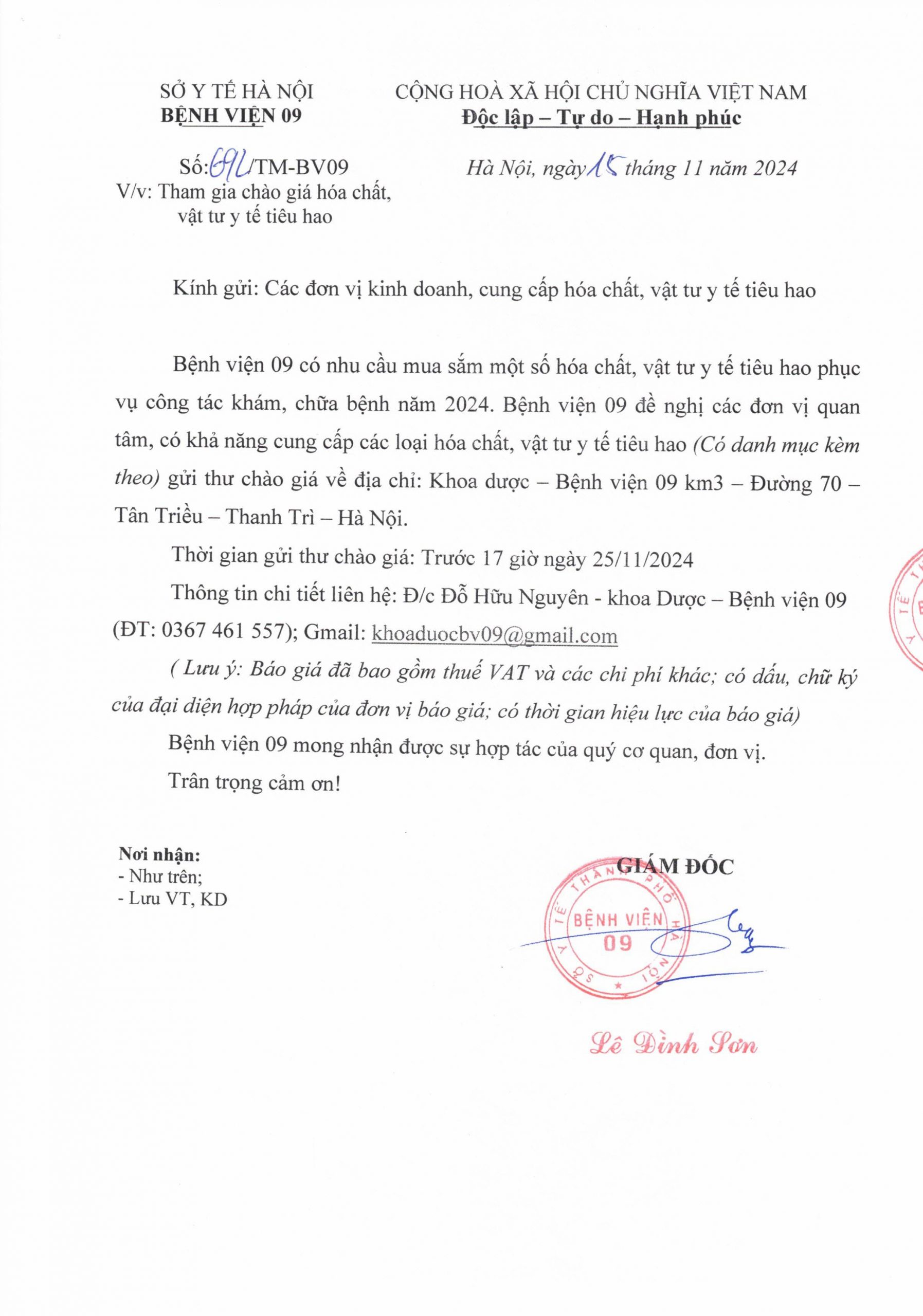 • Thư mời báo giá: “Gói thầu Khám sức khoẻ cán bộ nhân viên Bệnh viện 09 năm 2025”